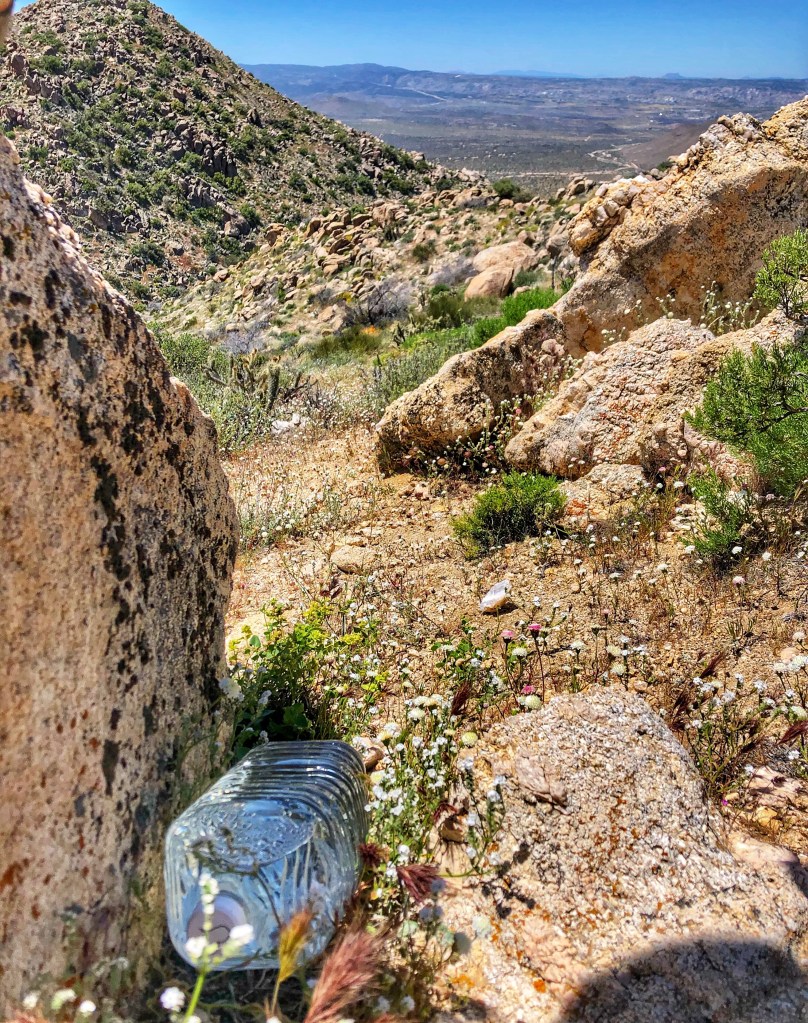 One can unwittingly cross into Mexico while hiking near Jacumba. There are gaps. The wall stops where rough topography discourages construction. In these spaces, the wall funnels passing animals and people into dry, onerous terrain. We briefly hiked off the trail and up a small rise to glimpse what lay ahead. Entranced by the view, it took me a moment to spot a cache of water hidden behind a rock. A Samaritan inked a heart on the bottle’s lid and the date on its side—11/8/2019. Should I take some? It was passing 90 degrees. Half of our water leaked from its bladder that morning. We would be fine sharing mine, but the margin was close. I had two gallons at my feet, yet the thought of taking even a quart as a hedge against thirst felt like an iniquity. An act of depriving someone in greater need. We moved on.